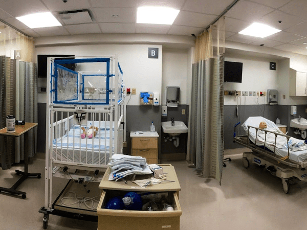 Outfitted with communications systems, wall suction/gasses, and other essential tools, the pediatric procedure room is ready for any pediatric-related procedure or situation.